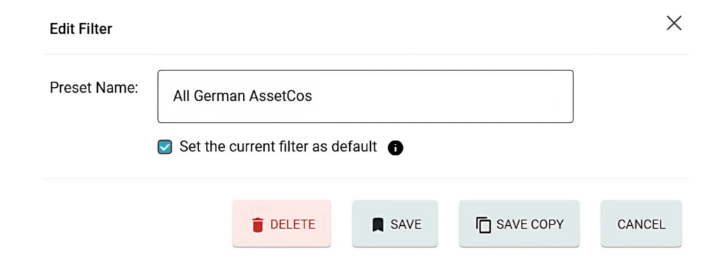 - Click “Save Filter” and give it a name (e.g. “All German AssetCos”) and click the “Set the current filter as default” box.