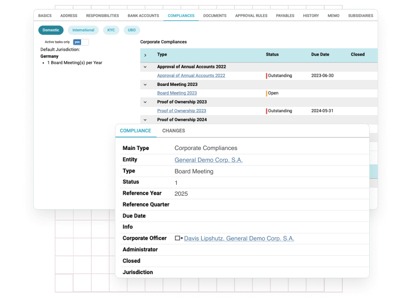 Manage different types of compliance tasks, domestic and international, corporate and tax, KYC, UBO, and everything you need.Task tracking
