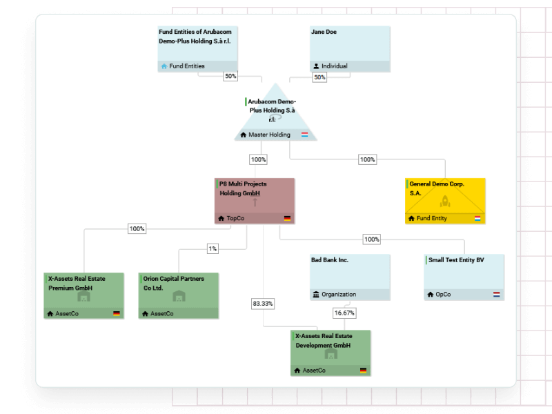 Our structure charts group legal entities under projects and visualize even vastly complex structures.Define custom fields
